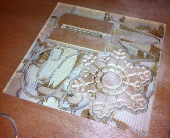I wanted to incorporate a snowflake into the design so I drew up the vectors for that. I then selected different fonts using the create text tool to draw up the other letters. This is quite a simple design to cut, and requires only two tools; a 90° 0.5” V-Bit for the snowflake design and to create a nice chamfered edge on both the snowflake and the letter ‘N’, and then we used a 0.25” Endmill to create two pockets; one to create the height difference for the ‘S’ and ‘W’ so that they are lower than the snowflake and the ‘N’. The other pocket was used between the spaces in the ‘N’ and ‘W’. The whole part was then profiled with the Endmill. It was a fairly quick project to cut out – where we cut the part in 0.7” (low quality) Plywood and for extra thickness we cut another piece that was just profiled all the the way through the material, and the two pieces were then glued together.