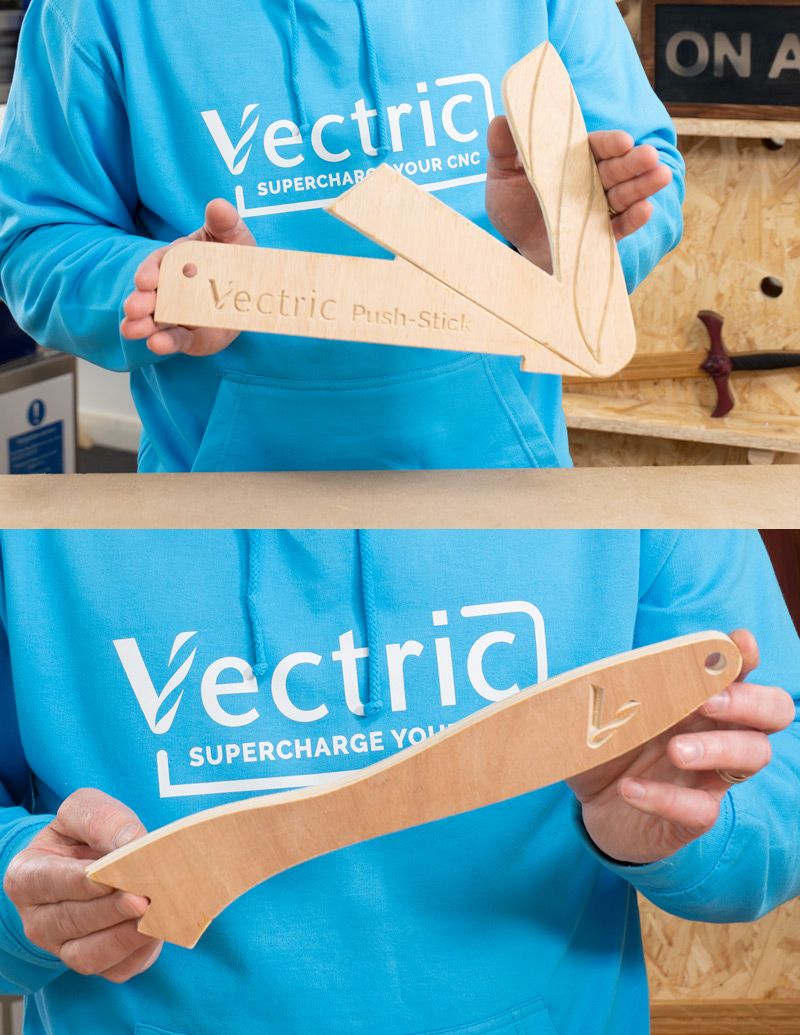 Next up is getting his material ready for the CNC and that will require him using the table saw. We are all about health and safety here at Vectric so making some custom push sticks will keep him safe and give you two push stick options to use in your shop!